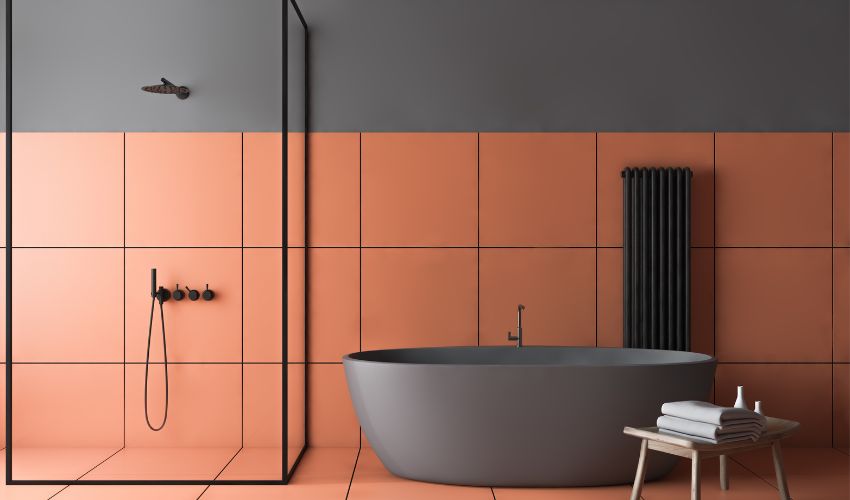 Arancione e grigio scuro: un bagno contemporaneo