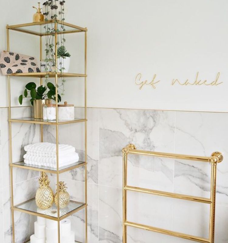 Il color oro può essere scelto per dettagli apparentemente piccoli dell’arredamento del bagno, come per esempio gli scaffali e i porta asciugamani. Vi piace questo spunto che abbiamo selezionato per voi?