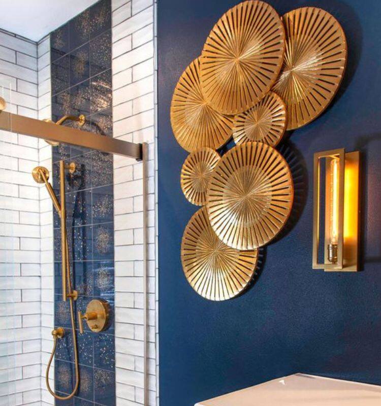 Iniziamo il nostro viaggio alla scoperta dei consigli per arredare un bagno color oro con uno spunto che vede protagonista, oltre al colore a cui è dedicato questo articolo, anche un meraviglioso blu. Il mix è elegante e originale, non trovate?