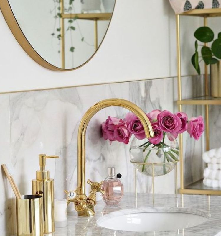 Scegliere il color oro per la rubinetteria e gli accessori da posizionare sul piano del lavandino può rivelarsi una scelta semplice e raffinata. Provare per credere!