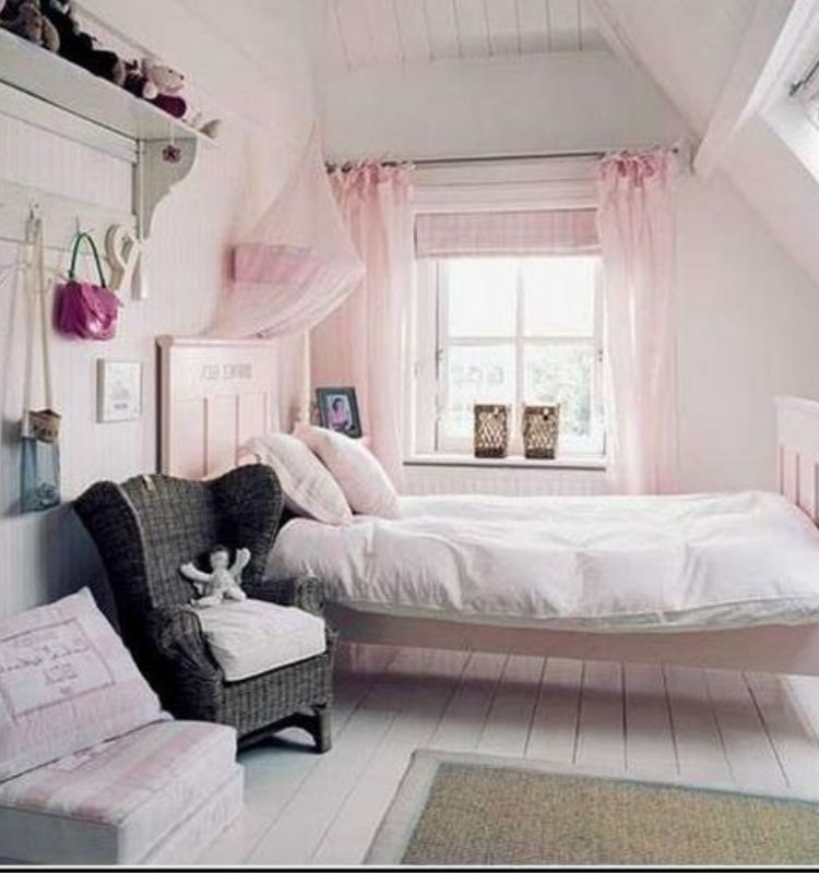Ecco che lo Shabby chic viene inserito in un contesto essenziale. Quest’ultimo valorizza l’aspetto glamour di tale stile. Un letto di legno, semplice, una poltrona di bambù, un piccolo baldacchino, il cui colore rosa tenue richiama quello delle tende. La cameretta Shabby chic è pronta.
