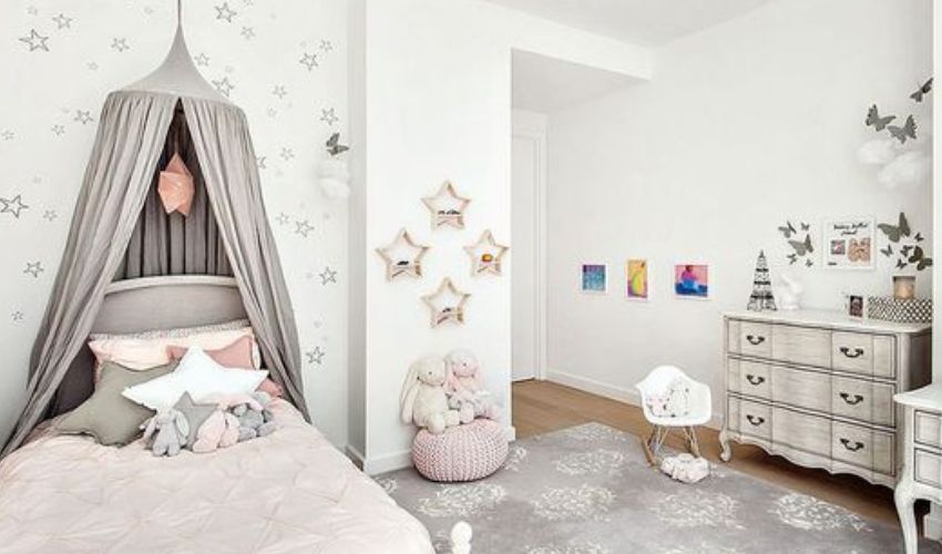 Anche i bimbi più piccoli possono avere la loro stanza Shabby chic. Questa della foto ha il baldacchino grigio perla che cade mollemente sul letto. Belle le stelle a decorare i muri. L’arredamento è essenziale. Sono gli accessori a fare il resto. Decorazioni, giocattoli, il grande tappeto centrale: una vera magia.