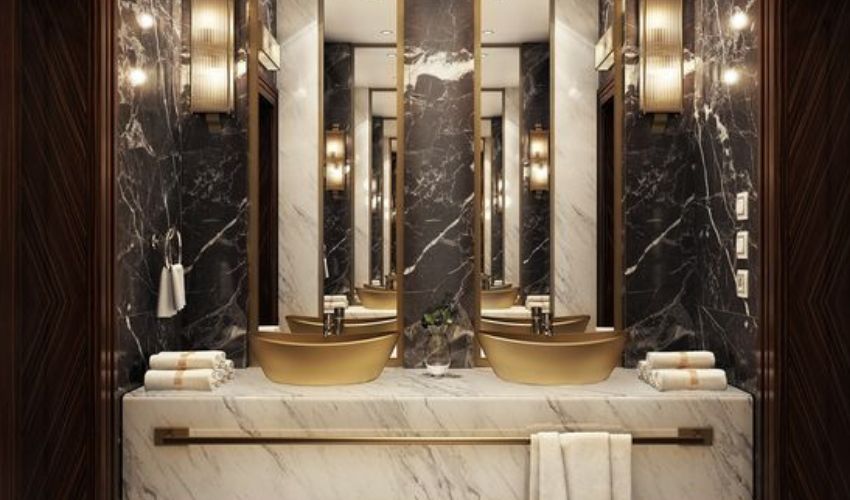 Vediamo ora un bagno caratterizzato dalla presenza di due lavabi e all’insegna del lusso. Tra marmo e dettagli color oro, la bellezza è davvero tanta!