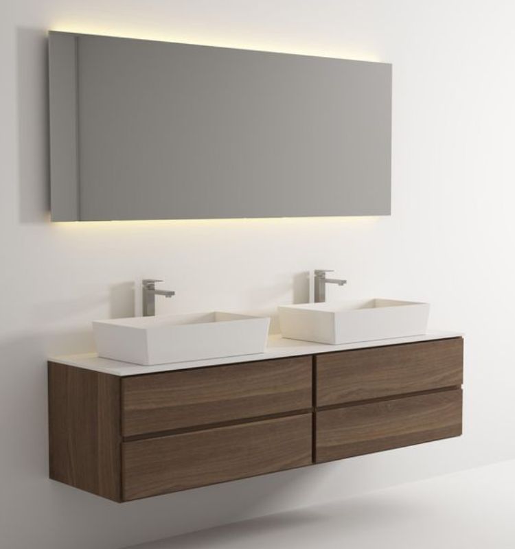 Concludiamo la nostra rassegna di consigli relativi al bagno con doppio lavabo con questo spunto dal mood squisitamente minimal. Le forme nette rendono tutto ancora più affascinante. Il mobile principale sospeso è un inno alla leggerezza e il dettaglio dello specchio retroilluminato è raffinatissimo.