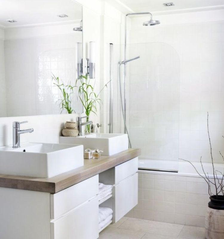Iniziamo il nostro viaggio alla scoperta della bellezza del bagno con doppio lavabo con questa proposta che vede in primo piano semplicità e raffinatezza. Sotto al doppio lavabo troviamo un piano in legno che crea un delizioso contrasto con il bianco dell’ambiente.