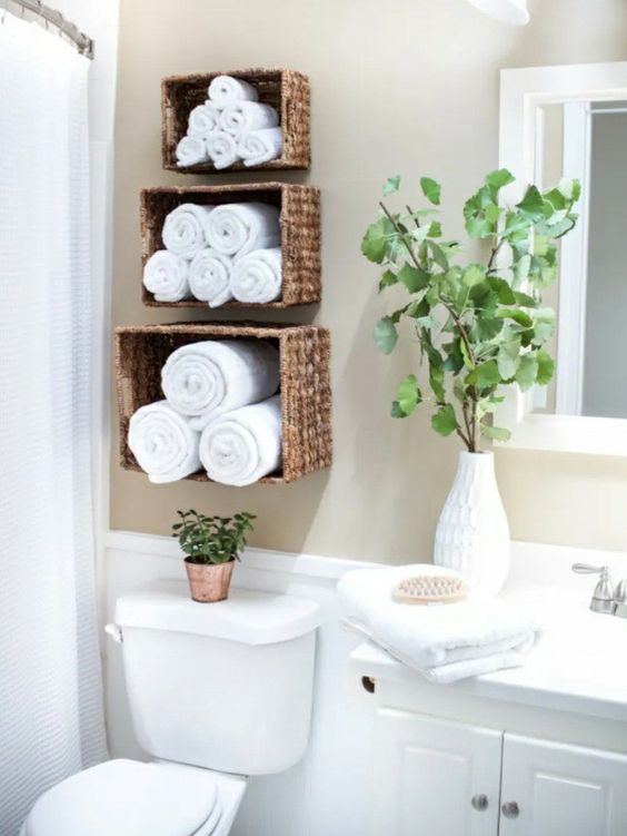 Strepitosa l’idea di adoperare dei cesti d vimini per creare degli scaffali porta tutto, da appendere, ad esempio, sopra il water. In questo modo, lo spazio viene preservato, non vi è nulla di ingombrante a terra e, in più, il vimini dei cesti è davvero assai decorativo.
