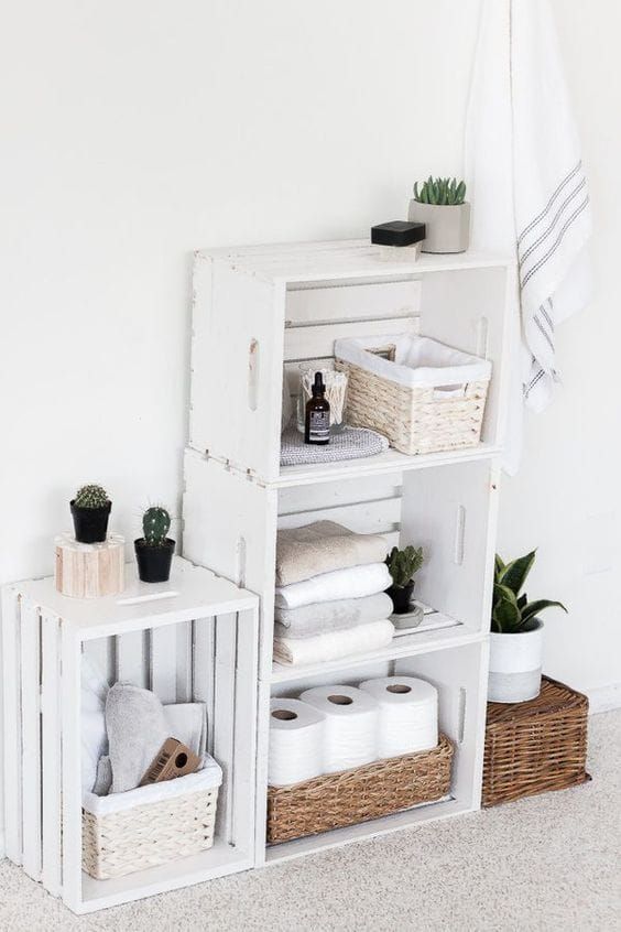 Riciclate delle cassette di legno e trasformatele in un bel mobile componibile da tenere nel bagno piccolo. Magari, dipingetelo di bianco o del colore che più vi aggradi. Con le cassette della frutta, che si reperiscono facilmente, create un arredo originale e super funzionale per ottimizzare lo spazio.