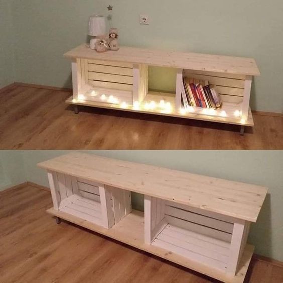 È possibile costruire un grazioso mobile multifunzionale combinando l’uso di due cassette della frutta e due assi di legno. Questo mobile potrebbe, ad esempio, fungere da piccola libreria e da supporto per la televisione.