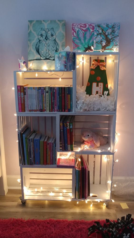 Uno degli spunti più apprezzati è quello di dare una mano di vernice alle cassette di legno e poi metterle in fila per formare una libreria. Il tocco in più, le lucette perfette per il periodo natalizio!