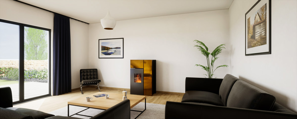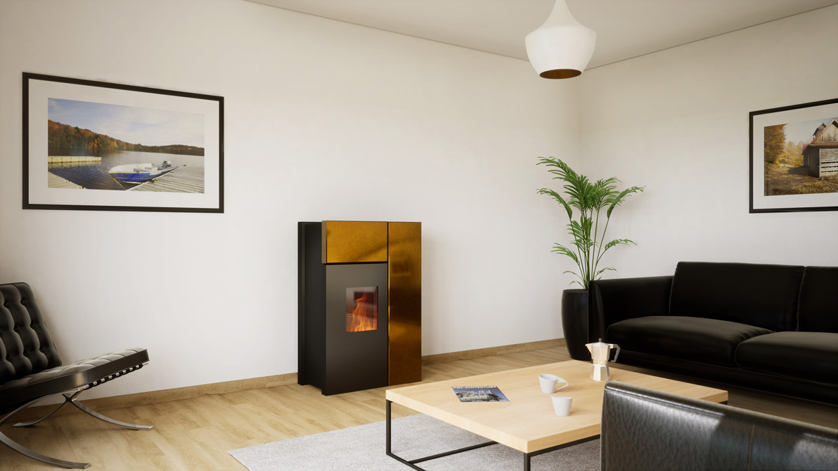 Invece, se nel salotto avete una nicchia dove in passato c’era un camino, utilizzatela per incassarvi la piccola stufa a pellet. In questo modo avrete risolto il problema dello spazio e riutilizzato un angolo del salotto senza rubare altro posto alla stanza.