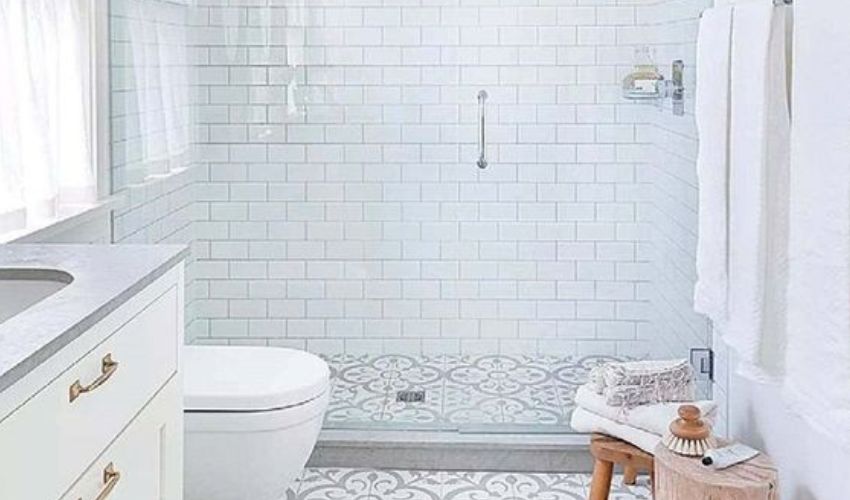 Il color tortora delle piastrelle sul pavimento, rigorosamente decorate con morivi floreali, si staglia tra il bianco luminoso delle mattonelle bianche adoperate per le pareti della stanza. Un’idea di design unica, per un bagno che cattura l’attenzione.