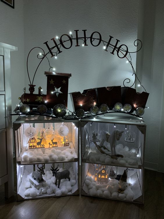 Ecco una composizione natalizia che sembra uscita da un romanzo di Dickens! Per riprodurla avrete bisogno di pochi, giusti elementi decorativi e naturalmente delle cassette di legno. I batuffoli di cotone renderanno la composizione ancora più suggestiva. Divertitevi a recuperare piccole, renne, gnomi, trenini, palle di vetro e cavalli a dondolo nei negozi o nei mercativi dell’usato.