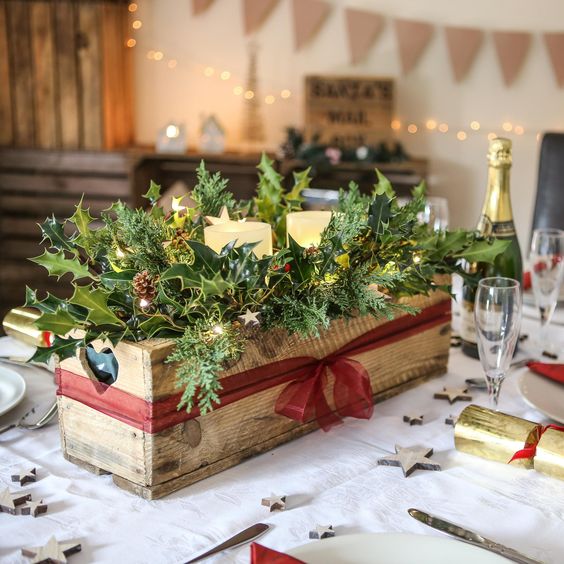 Realizzate un centrotavola natalizio con una cassetta di legno e non sbaglierete! Vi basteranno due candele, diversi elementi naturali come pigne, foglie innevate, bacche e rami di pino, abete e via dicendo. In alternativa, potrete utilizzare ornamenti artificiali in vendita nei negozi in questi giorni. Un bel fiocco rosso per omaggiare il Natale e la vostra tavola si vestirà a festa, senza risultare pomposa.