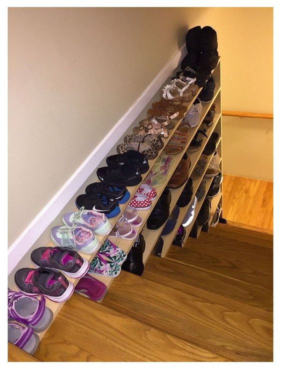 Come ottimizzare lo spazio con intelligenza. Ecco la scarpiera realizzata con delle mensole (che potete anche fare da voi, riciclando del legname che avete in casa), sfruttando lo spazio laterale alle scale di casa. Un’idea da copiare.