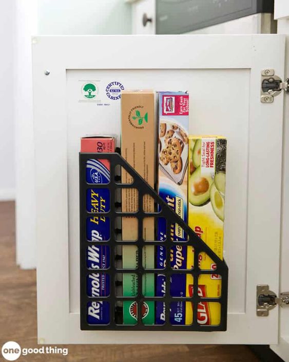 Utilizzare un organizer da ufficio per tenere in ordine le pellicole da cucina, è davvero un’idea originalissima. In questo modo, non dovrete comperare un accessorio apposito ma avrete riciclato qualcosa che già avevate in casa.