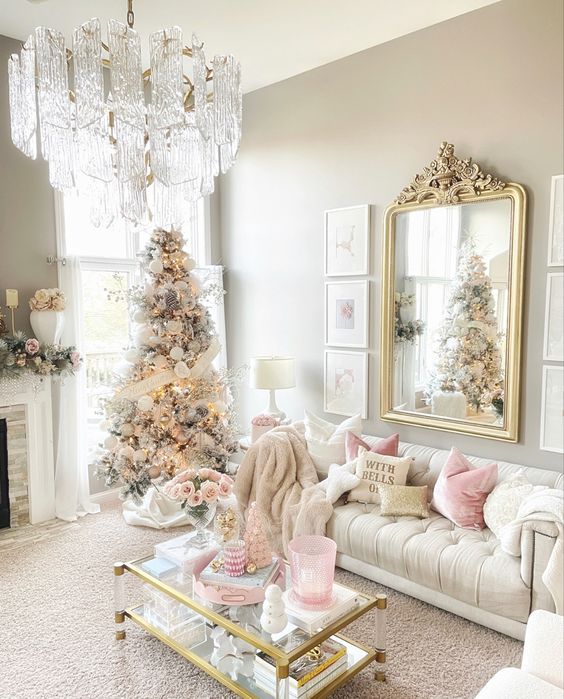 Il soggiorno shabby di Natale non disdegna il rosa che sapientemente si amalgama alle altre tonalità lievi, il bianco su tutte. In questo soggiorno spicca lo specchio dalla cornice dorata che richiama le decorazioni dell’albero. Una magnifica idea di stile shabby.