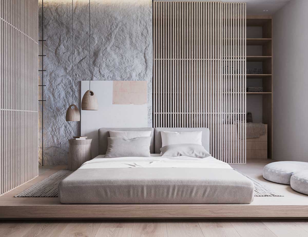 Il primo elemento su cui concentrarsi è lo spazio intorno al letto. È importante mantenere uno spazio sufficiente intorno al letto per muoversi facilmente e per creare una sensazione di apertura e libertà nella stanza. Come detto sopra, una soluzione minimalista potrebbe essere quella di scegliere un letto con un design a basso profilo, come un futon giapponese, che crea uno spazio intorno al letto più ampio e libero.