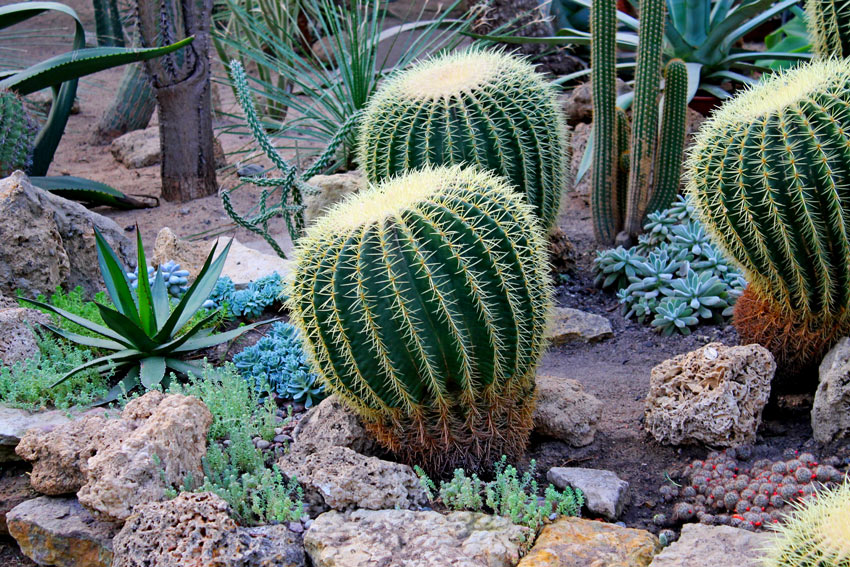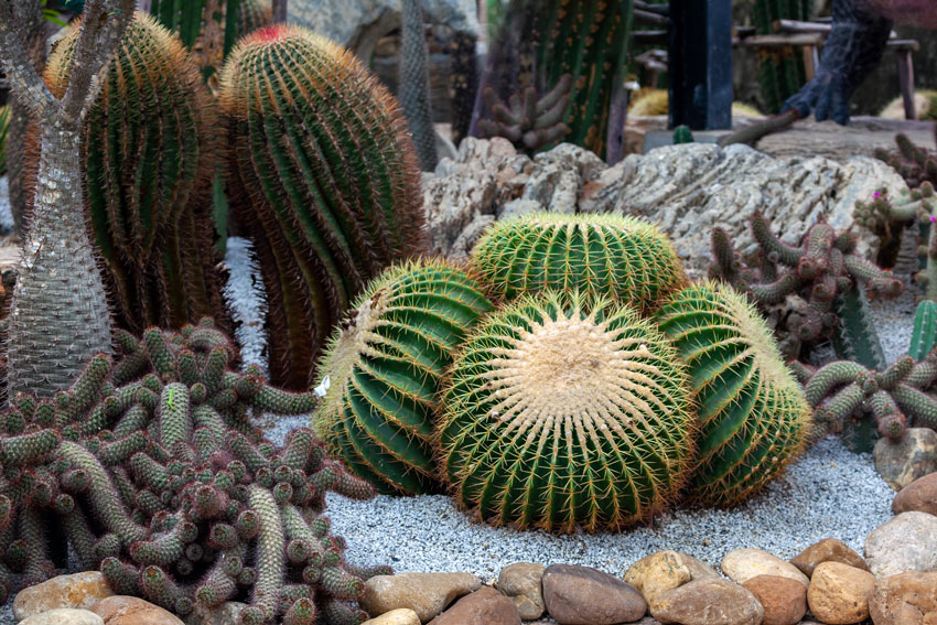 - Echinocactus grusonii: Nota come “Cuscino di suocera”, questa pianta sferica aggiunge un elemento divertente e di forte impatto visivo, perfetto per creare punti di interesse e movimento tra le pietre.