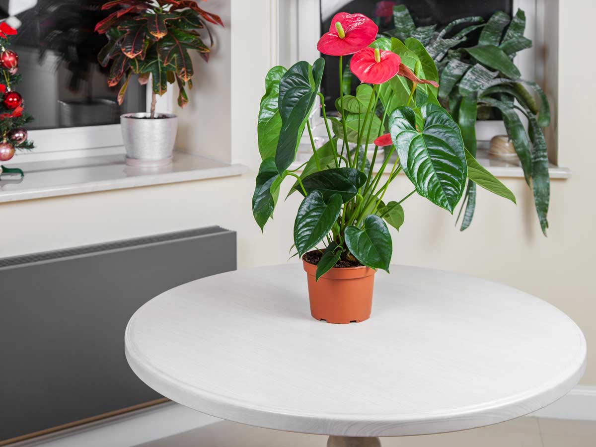Il fiore di fenicottero (Anthurium) è conosciuto per le sue brattee rosso brillante e cerose che spiccano in qualsiasi ambiente. Questa pianta non solo è bella, ma è anche facile da mantenere. Richiede innaffiature occasionali e una semplice pulizia delle brattee con una spugna umida per mantenere la sua bellezza.