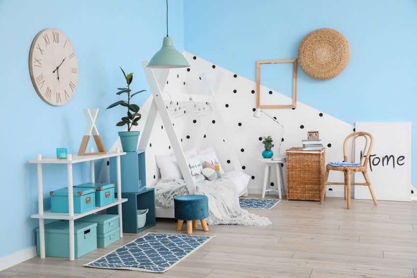 Se scegli pareti dai toni freddi, come l’azzurro o il verde menta, opta per mobili in legno naturale o bianco, che creano un piacevole contrasto senza spezzare l’armonia della stanza.