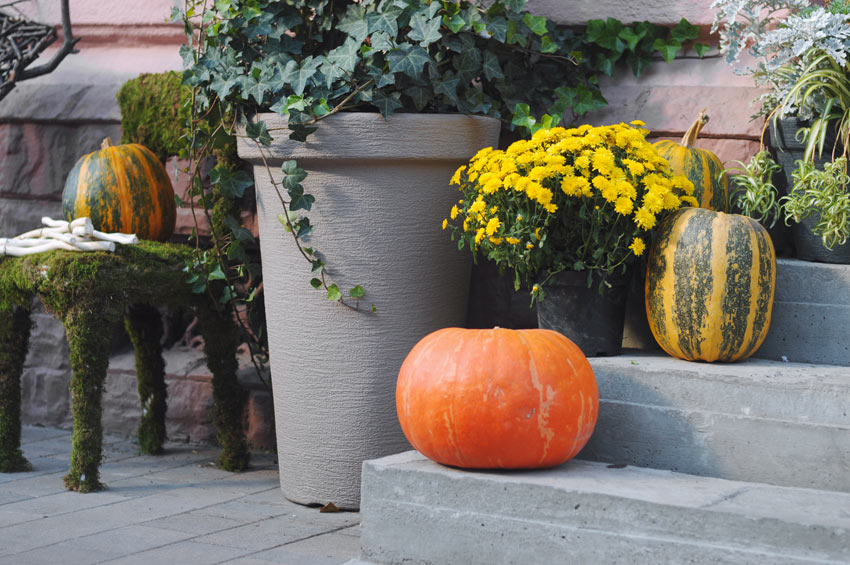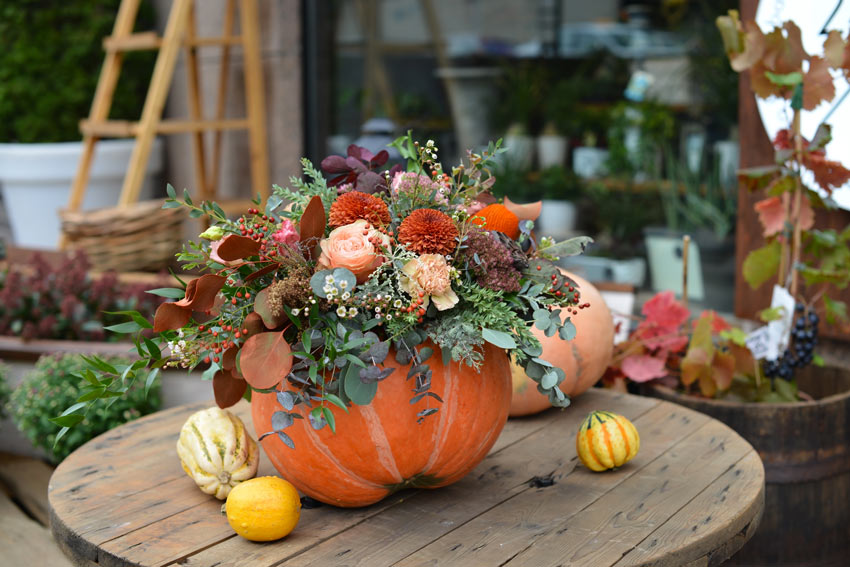 Le zucche possono anche essere posizionate in contenitori di legno o metallo insieme a fiori e foglie secche, creando un vaso insolito che si adatta perfettamente sia a case rustiche, sia a contesti arredati con mood moderno.