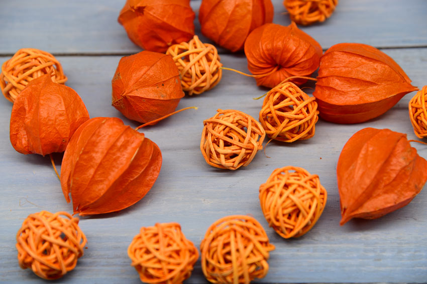 Se preferisci un centrotavola fai da te, puoi utilizzare sfere di rattan arancione abbinate a bacche di physalis, note per il loro bellissimo colore arancione e facilmente reperibili nei negozi di arredamento o bricolage.